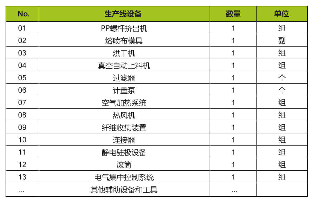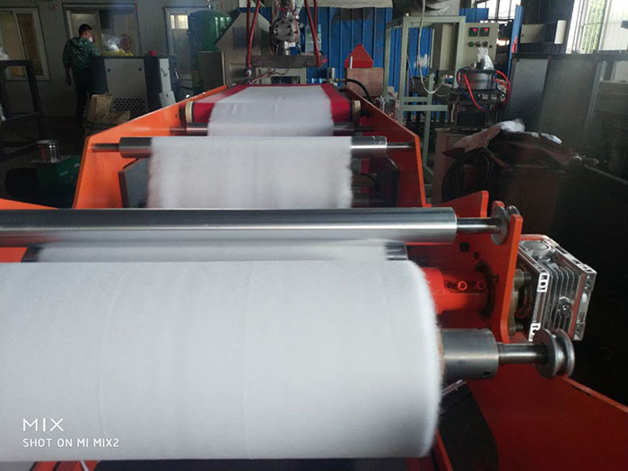 整體生產線采用熔噴法進行生產,具體指的是借助高速熱氣流使剛擠出的高聚物熔體迅速高倍拉伸固化成形的紡絲方法。熔噴法生成的無紡布纖維更細,表面積更大,具有好的過濾性、屏蔽性、絕熱性和吸油性,這些是其他工藝生產的無紡布所不能比擬的。