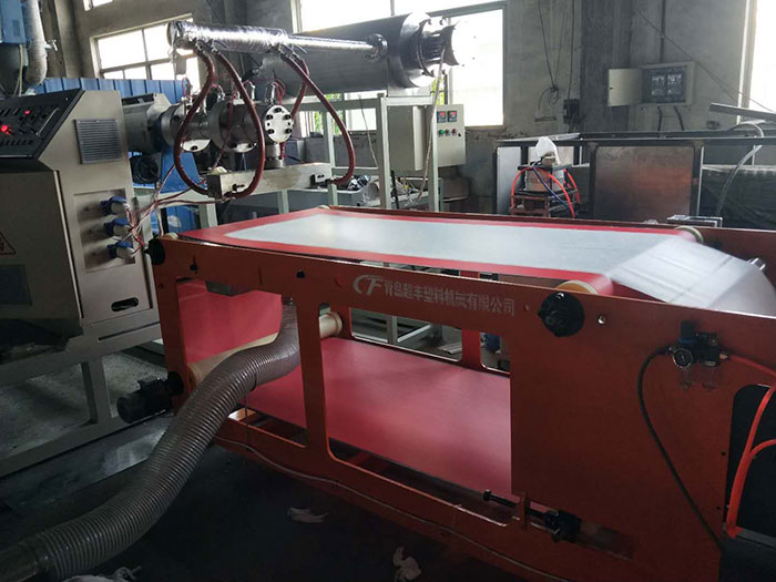 全自動加料機---->塑料干燥機---->螺桿擠出機---->過濾器---->計量泵---->加熱系統---->熔噴箱體---->成網機---->收卷---->分切機